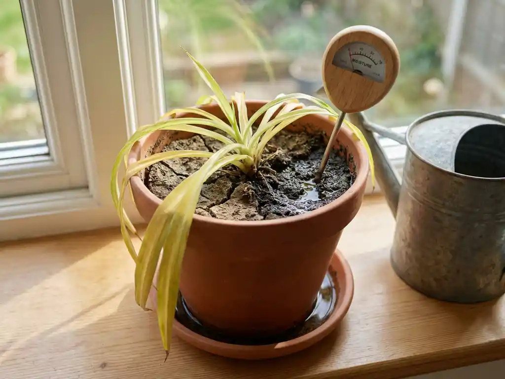 Kellastuva huonekasvi kuivassa ja märässä mullassa, kosteusmittari ja kastelukannu ikkunalaudalla, luonnonvalo